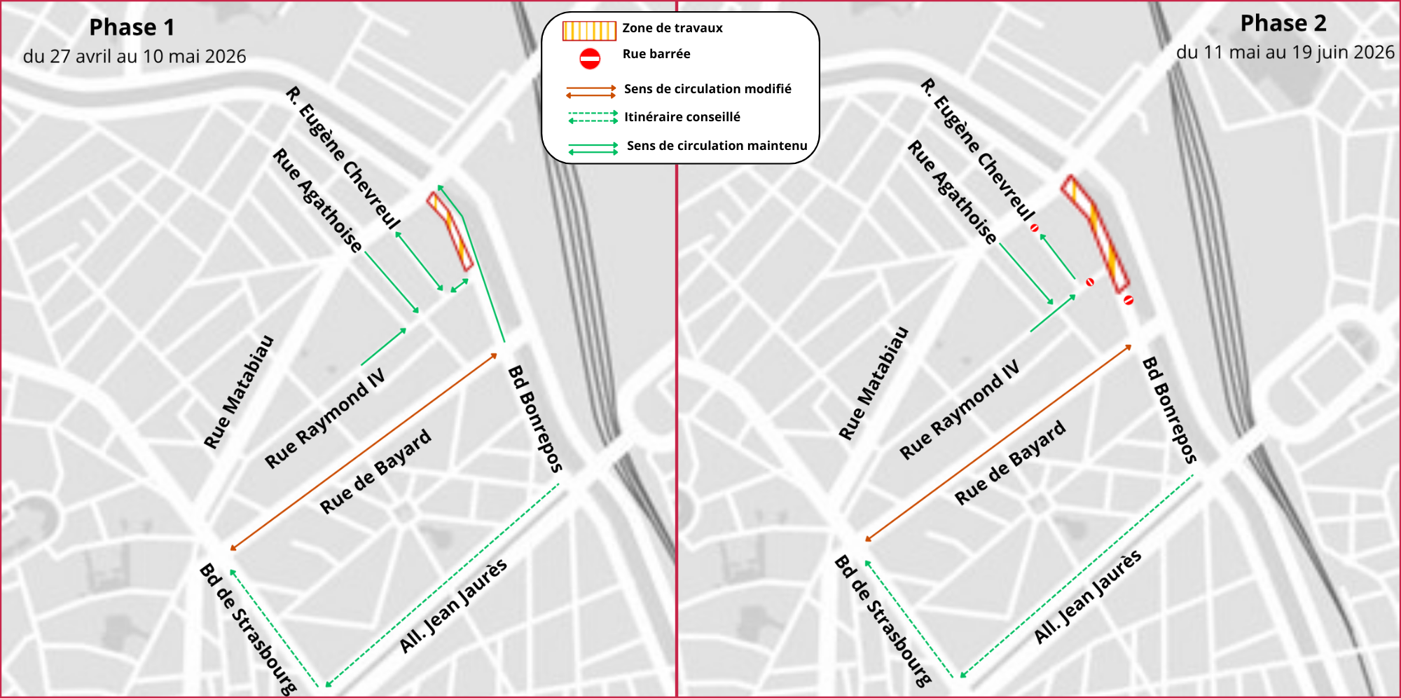 Attention ! Le sens de circulation rue de Bayard sera modifié. Elle sera accessible dans les deux sens, depuis le boulevard de Strasbourg et depuis le boulevard Bonrepos.