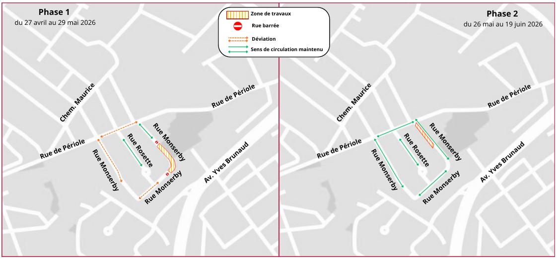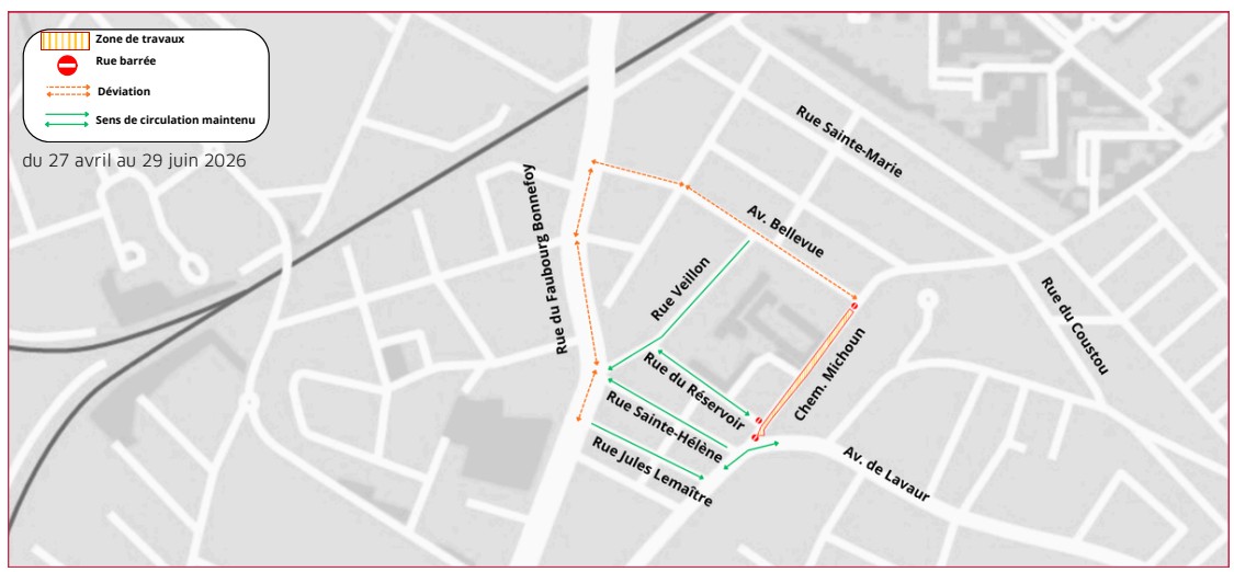 - Piétons : circulation maintenue et sécurisée de part et d’autre de la chaussée. Un pont piéton provisoire sera installé pour permettre le passage. Fermeture chemin Michoun vers la rue du Réservoir.