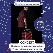 De ses débuts dans les bals gaillacois à un voyage chez un accordéoniste tzigane roumain, Florian Demonsant retrace son parcours musical avec sincérité et fantaisie. L'accordéon ouvre grand son soufflet pour un concert qui mêle musiques populaires et sonorités inattendues. Un moment surprenant et intimiste, à vivre en famille dès 6 ans.